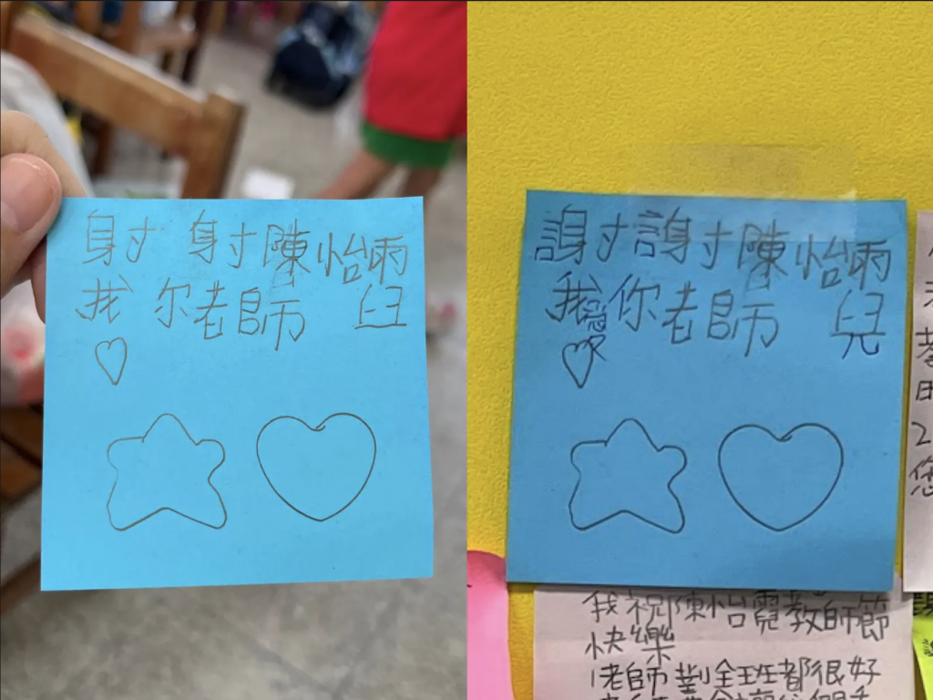 「謝謝、我愛你、老師、國語數學」是他最早學會的幾個字,而他將這些寫進教師節卡片,也努力寫出了我的名字。