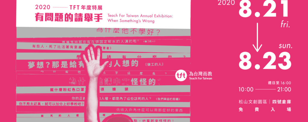 2020 TFT年度特展以「有問題的請舉手」為主題,結合 #展覽 與 #對談,透過社會議題和教學現場的真實故事,與大家分享 TFT 對「教育問題是社會問題的縮影」的觀察與反思。