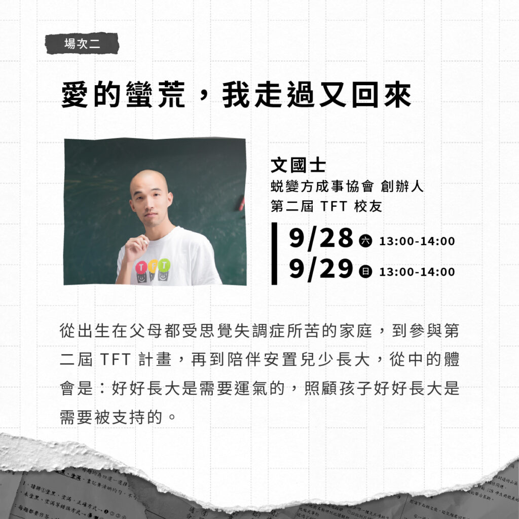 從出生在父母都受思覺失調症所苦的家庭,到參與第二屆的 TFT 計畫,再到陪伴安置兒少長大,從中的體會是:好好長大是需要運氣的,照顧孩子好好長大是需要被支持的。