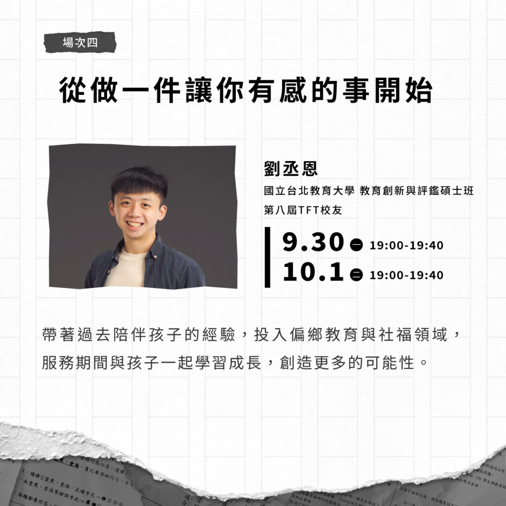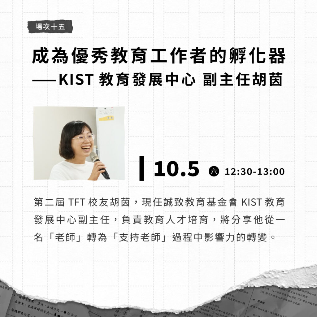 第二屆 TFT 校友胡茵,現任誠致教育基金會 KIST 教育發展中心副主任,負責教育人才培育,將分享他從一名「老師」轉為「支持老師」過程中影響力的轉變。