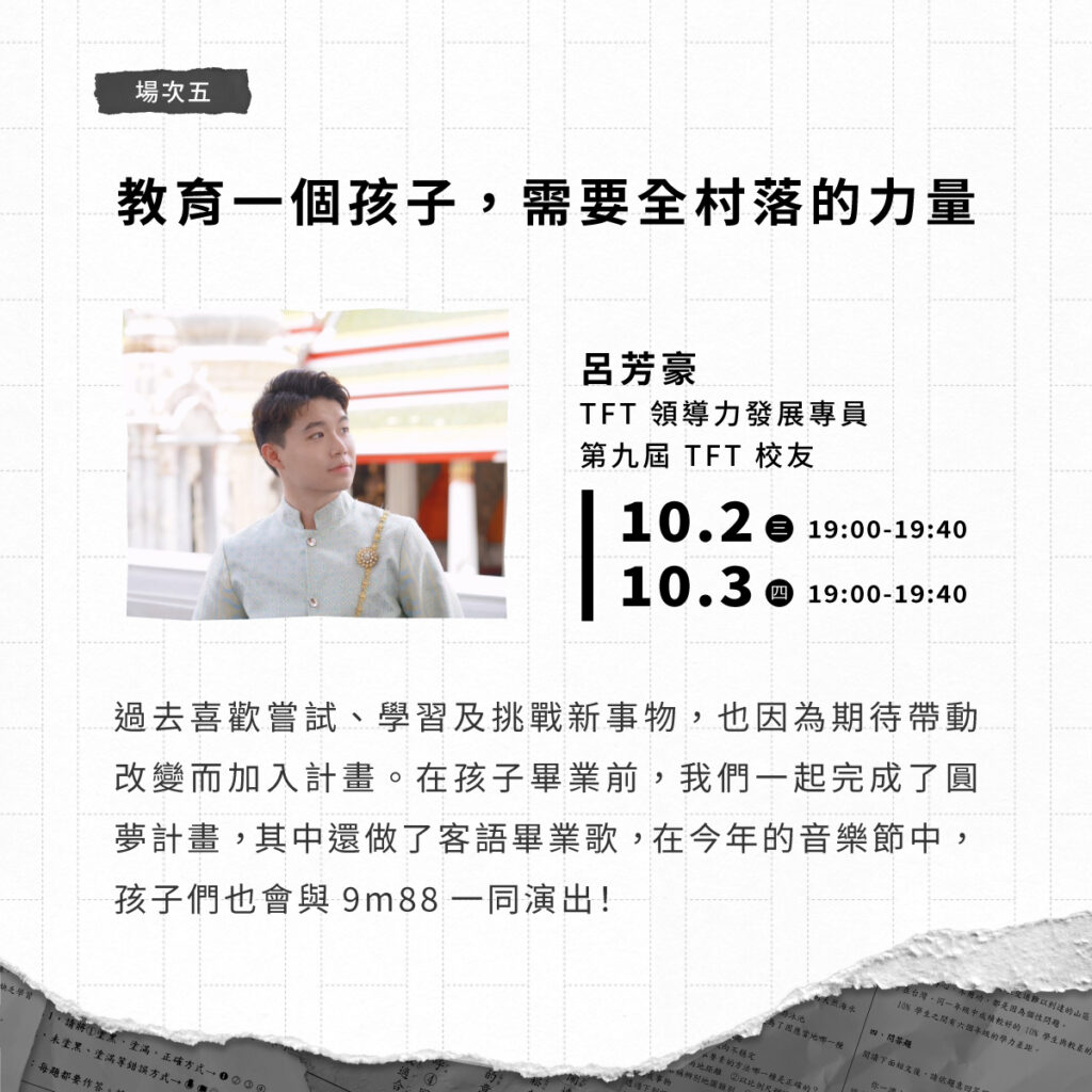 跨界對談更邀請到前文化部長鄭麗君、台大社會系教授藍佩嘉、Netflix台劇《誰是被害者》總監製曾瀚賢、《做工的人》製作人林昱伶、《廢墟少年》作者簡永達、TFT 創辦人劉安婷與 3 位 TFT 校友同台對談,分享社會議題與教室內問題的關聯。