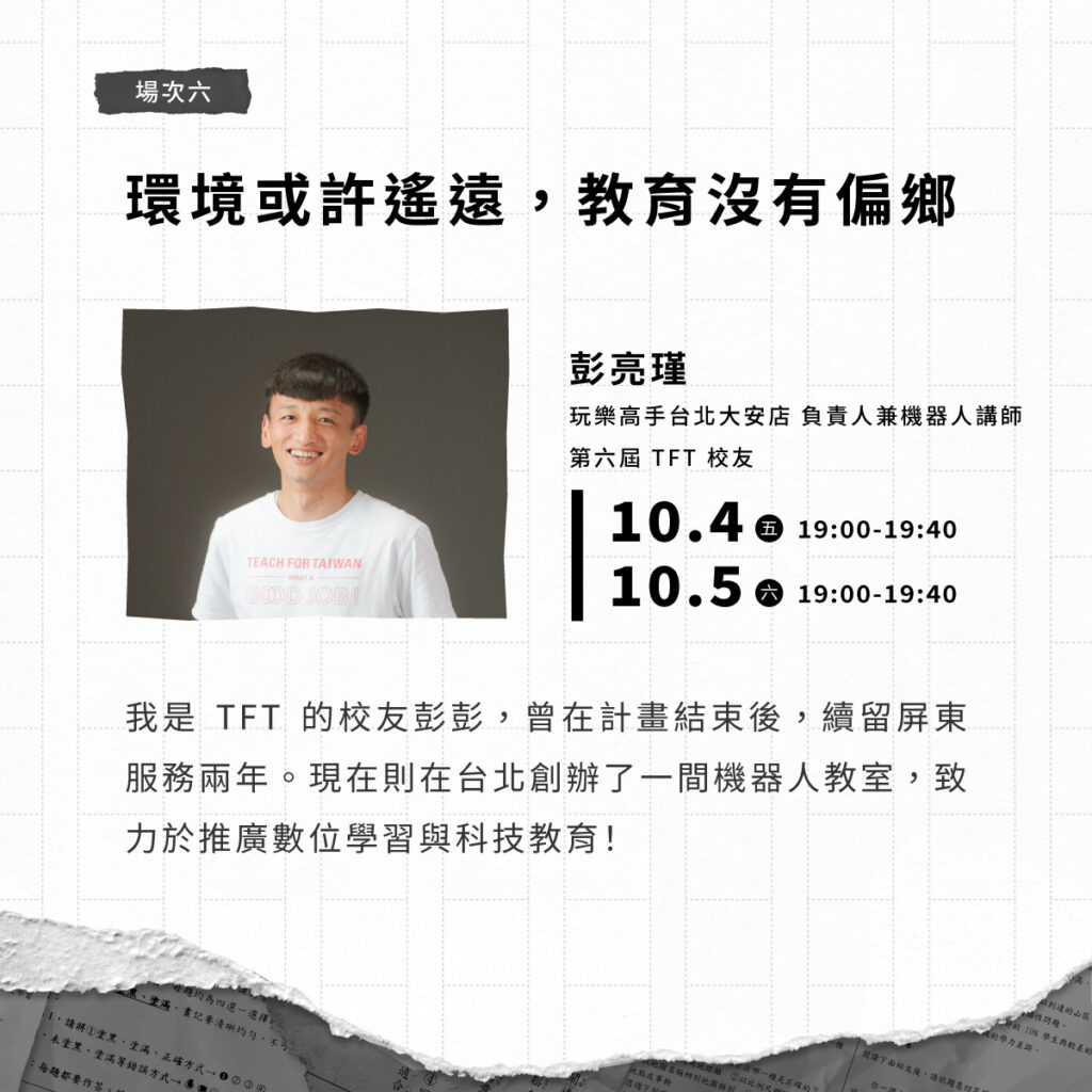 我是TFT的校友彭彭,曾在計畫結束後,續留屏東服務兩年。現在則在台北創辦了一間機器人教室,致力於推廣數位學習與科技教育!