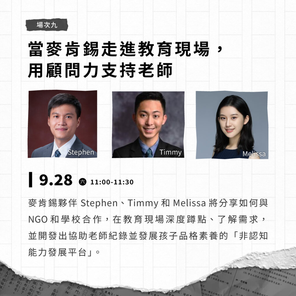 麥肯錫夥伴 Stephen、TImmy 和 Melissa 將分享如何與 NGO 和學校合作,在教育現場深度蹲點、了解需求,並開發出協助老師紀錄並發展孩子品格素養的「非認知能力發展平台」。