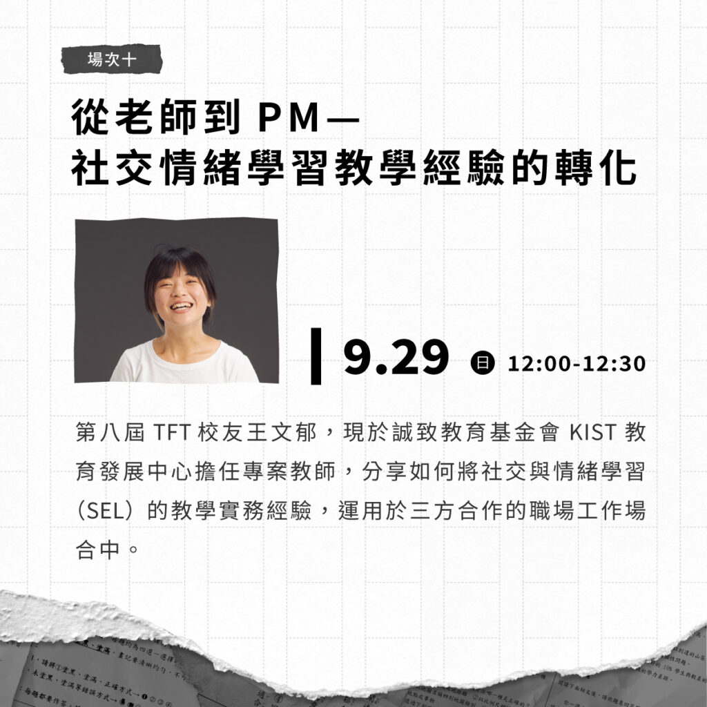 第八屆 TFT 校友王文郁,現於誠致教育基金會 KIST 教育發展中心擔任專案教師,分享如何將社交與情緒學習(SEL)的教學實務經驗,運用於三方合作的職場工作場合中。