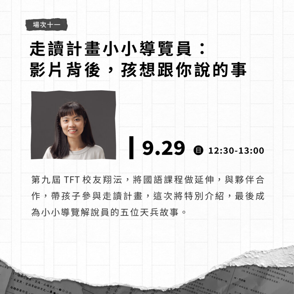 第九屆 TFT 校友翔沄,將國語課程做延伸,與夥伴合作,帶孩子參與走讀計畫,這次將特別介紹,最後成為小小導覽解說員的五位天兵故事。