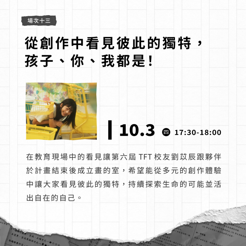 此系列無需報名,來現場即可參與!在年度展覽中,我們邀請共同為孩子創造優質教育的夥伴,分享他們如何透過創新與創意,為孩子帶來豐富且多元的學習體驗。他們將從自身的經歷出發,分享如何將在教育創新領域發揮影響力!