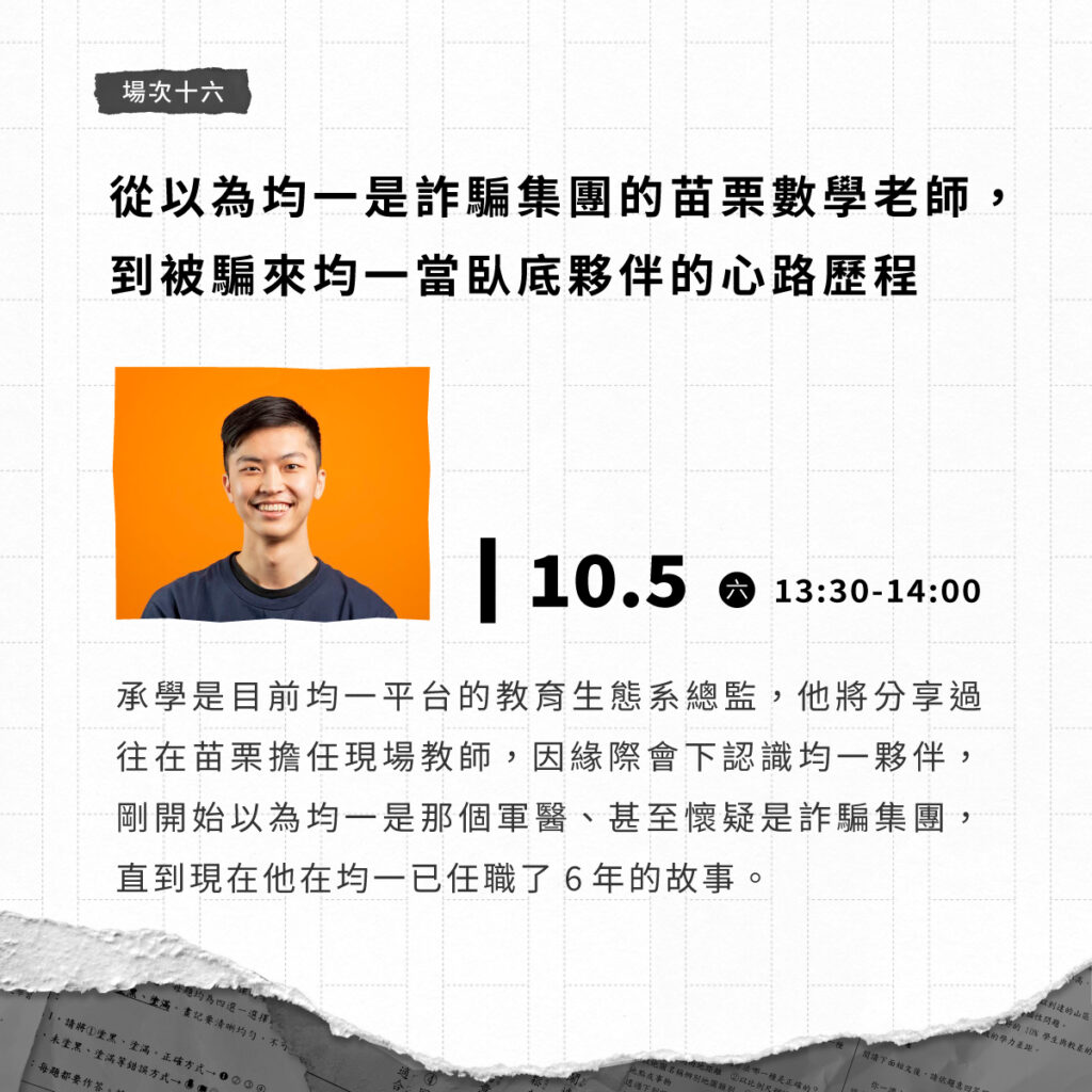 承學是目前均一平台的教育生態系總監,他將分享過往在苗栗擔任現場教師,因緣際會下認識均一夥伴,剛開始以為均一是那個軍醫、甚至懷疑是詐騙集團,直到現在他在均一已任職了 6 年的故事。