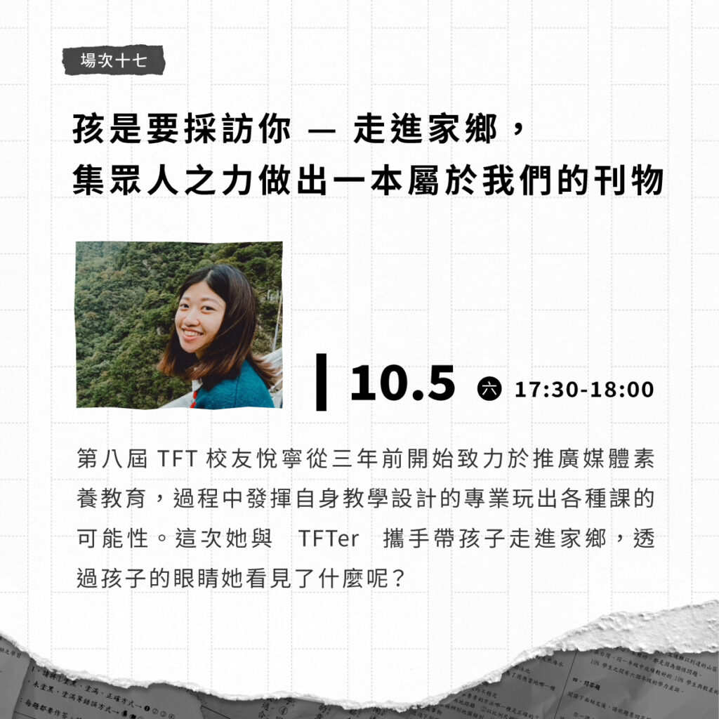 第八屆 TFT 校友悅寧從三年前開始致力於推廣媒體素養教育,過程中發揮自身教學設計的專業玩出各種課的可能性。這次她與 TFTer 攜手帶孩子走進家鄉,透過孩子的眼睛她看見了什麼呢?