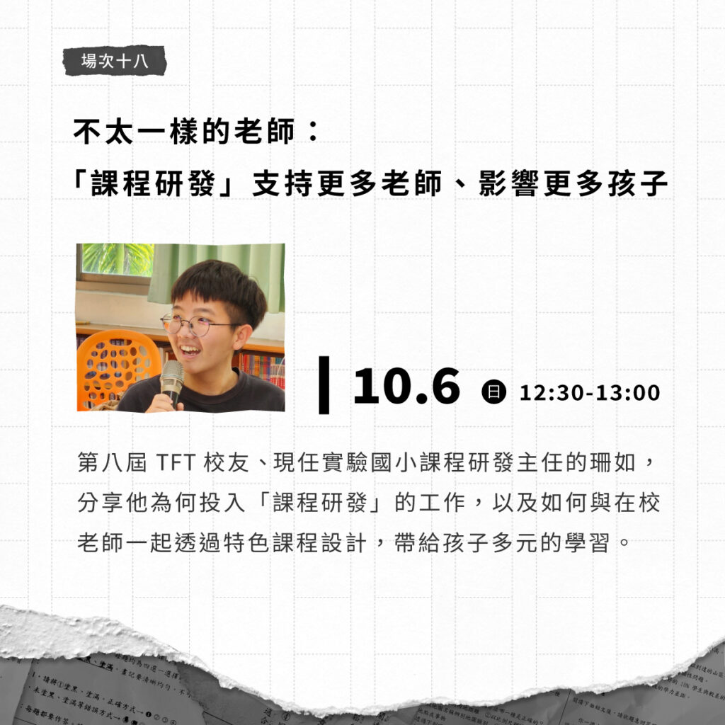 第八屆 TFT 校友、現任實驗國小課程研發主任的珊如,分享他為何投入「課程研發」的工作,以及如何與在校老師一起透過特色課程設計,帶給孩子多元的學習。
