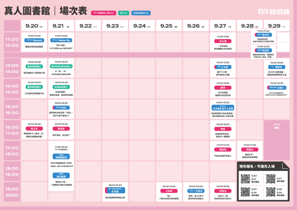 2025 有感節 音樂節 市集 展覽 跨界對談 預先報名 選單 2025 有感節 音樂節 市集 展覽 跨界對談 預先報名 好感人募集中 「最高品質 —— 靜悄悄 —— 」小時候,只要同學稍微吵鬧點,老師總會這麼說。認真聆聽、專注抄寫筆記是教室內很美妙的風景,能彼此討論、熱烈交流的課堂,也有很迷人的地方。在我們的生活或工作中,也是如此。默默付出的人很值得敬佩,能夠自在地呼朋引伴也很厲害。 我們可以有不同的方式,來追求自己所定義的「最高品質」,所以,最高品質,後面要接什麼呢? 今年的有感節,邀請你來聽見 —— 孩子的聲音、老師的聲音、社會的聲音,還有你自己的回答。找出屬於自己的最高品質,還有你想要的回應方式。 每年,我們都希望可以透過展覽,讓每位觀眾,都能從中多認識一點點教育不平等議題。在展覽中,我們以「故事」作為媒介,邀請大眾一同從文字、影像,甚至是真人分享的多元形式中,拿起認識議題的那顆敲門磚。 活動亮點 #不只好看好拍,還讓你沉浸式的體驗 這次,我們想邀請你打開門,走進故事裡。這次展覽有幾個「房間」等你進去坐坐,有著不同角色的日常,揉合著期待、快樂、煩惱、焦慮和埋藏在心裡還沒有說出口的話。走進別人的日常,也許你會在這些平凡場景中,聽見一點不平凡的靜悄悄。 #你的最高品質,也值得被看見 雖然叫做展覽,但我們從不甘願只做一個把故事「展」出來,讓大家單向瀏「覽」的企劃。在這裡,我們也邀請你一起共創。你可以留下你心目中的「最高品質」,寫下一句話、留下貼紙、或蓋個印章——或許在展場某個角落,你會遇到也相信那句話的人,一起成為彼此的答案。 #還有不定期真人圖書館分享 我們相信,再多樣的故事,都可能不夠立體。所以我們邀請了曾經或現在正參與 TFT 計畫的夥伴、教育現場的孩子,以及多元領域的好朋友來到現場,跟大家分享有時是淚水,有時是成就感,有時是撐下來的那一刻。真人圖書館活動需報名,點以下各活動報名參加! 常見問答 交通方式 搭乘台北捷運 忠孝新生站:1 號出口步行約 3 分鐘善導寺站:6 號出口步行約 5 分鐘 搭乘公車 華山公園站(市民大道):669台北科技大學站(八德路):205、257、276忠孝國小站:202、202 區、212、212直、232、231 副、269、299、600、605、605 副、605 新台五線、忠孝新幹線華山文創園區(忠孝東路):247、205、212、220、232、232 副、257、262、276、臺北市雙層觀光巴士 自行開車 停車場入口處在忠孝東路上;園區提供 24 小時停車服務汽車平日每小時 40 元、假日每小時 60 元,平日 280 元/天、假日 540 元/天機車每小時 25 元 各種想問的都在這 展覽內可以拍照攝影嗎? 可以!歡迎來展覽拍照打卡,留下你對於展覽的專屬回憶。 請問展覽有招募活動志工嗎? 今年的有感節不會對外招募活動志工。TFT 不會透過私訊、留言或其他非官方管道招募活動志工。若您看到相關訊息,請不要理會,避免受騙,並協助檢舉或回報給我們。 請問現場有人流管制或年齡限制嗎? 為提供良好的觀展品質,展覽若遇尖峰時段,將進行人流管制,邀請觀眾於場外排隊等候,視場內情況盡快讓排隊觀眾入場,按過往經驗,等候時間約 5-10 分鐘可進入場館。此外,觀眾並無沒有年齡限制,我們歡迎各個年齡層的觀眾,一起了解教育不平等議題! 去年展覽回顧 來過的人都有感! 展覽資訊Exhibition 活動時間 9/20 (六) – 9/29 (一) 10:00-20:00週末延長至 21:00 閉展最後一天 9/29 16:00 閉展 活動地點 華山1914文創產業園區 中4B館(台北市中正區八德路一段1號) 參與方式 免費入場 空間規劃團隊 點我返回頂部