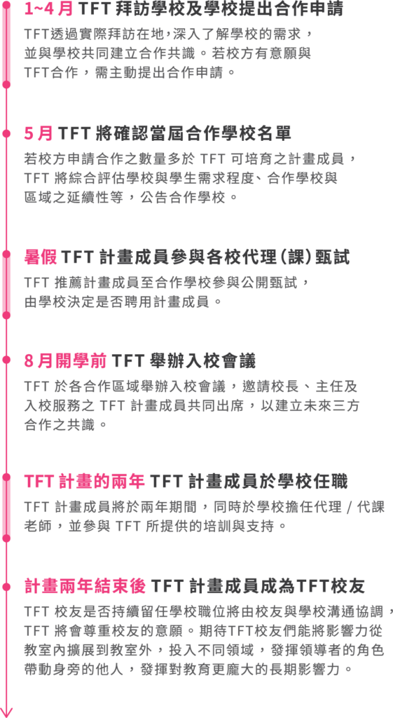 • 為了使 TFT 計畫成員陪伴孩子走完一趟完整的歷程,TFT 計畫成員以能在同一合作學校服務兩年為原則。兩年間可依校方需求及教師條件轉換聘用方式。