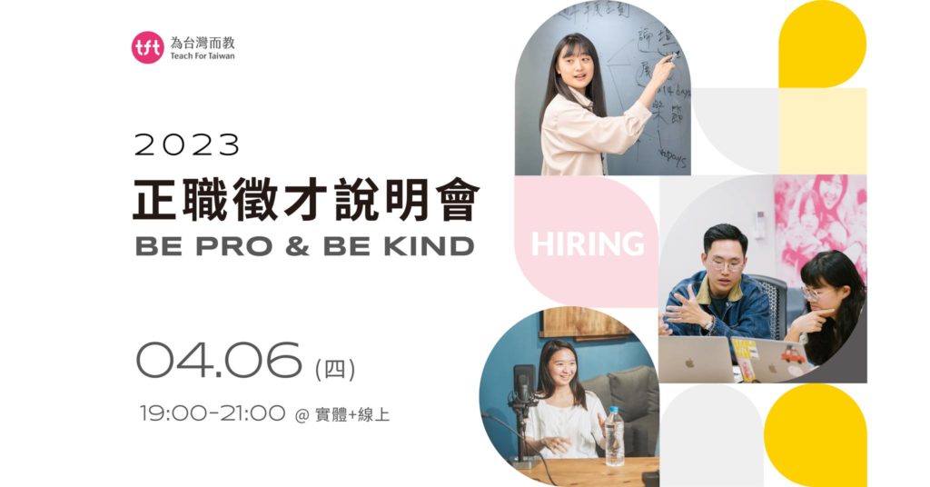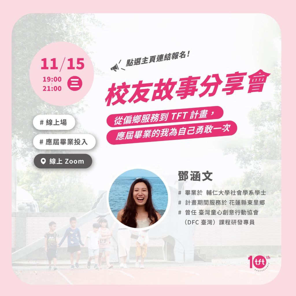 最新活動資訊 TFT 相關活動 推薦給想了解教育現場、想投入TFT 計畫或是單純想更了解我們的你! Coming soon… 【TFT 校友故事分享會】今年最終場! 日期 12/30(二)19:00-20:30,18:45 開放上線入場 參與方式 線上 Zoom,免費報名參加 活動內容 你曾經覺得工作沒有意義,想找一份有回饋感、真正讓人開心的工作嗎?本場邀請走過兩年計畫的第十屆 TFT 校友嘉欣,分享商管背景的他如何從一位上班族到參與 TFT 計畫、入校後發生的故事,以及兩年計畫的經歷如何影響兩年後的下一步選擇。 報名活動 【實驗式創作工作坊】TFT × 畫的室|與平行時空的自己對「畫」 日期 12/19(五) 19:00-21:00 參與方式 免費報名參加- TFT 辦公室實體參與,限量報名 活動介紹 活動簡介 🪐 如果你能和平行時空的自己對話,你會說些什麼?這次,我們邀請由 TFT 校友創立自由創作品牌「畫的室」,帶著你透過創作與直覺,和現在的自己對話,也和另一個平行時空的故事對「畫」。 活動內容 這是一場結合「自由創作 X 故事交流 X 交換畫作」的體驗式工作坊:➊ 故事對話|聽見 TFT 校友在教育現場的真實故事,以及他們如何把兩年的經驗轉化成創業的養分➋ 與自己對畫|透過媒材、顏料自由創作,畫一幅關於自己的作品➌ 與夥伴對話|與其他參與者分享彼此的創作➍ 與孩子換畫|最後帶走一張由高需求地區孩子創作的明信片作品 活動資訊 免費活動,限額 50 名,將視報名表單內容,優先提供給對「TFT 計畫」、「教育現場」與「計畫後職涯發展」有興趣的朋友活動需脫鞋進場。因為會使用壓克力顏料,沾到襪子不太容易洗掉,建議穿著不怕弄髒的襪子18:45開放入場,並於19:00準時開始,請留意入場時間 報名活動 【教學賦能工作坊】 時間 第一梯次:2025/12/14(日)12:30-18:00第二梯次:2026/01/25(日)12:30-18:00第三梯次:2026/03/22(日)12:30-18:00第四梯次:2026/04/26(日)12:30-18:00 參與 & 報名方式 僅限通過網路面試、進入現場面試的申請者參加。報名資訊將在「網路面試結果公告」後,由 TFT 招募團隊透過 Email 另行邀請。可實體或線上參與,惟實體參與效果較佳。 活動說明 有八成的申請者來自跨領域背景,或許因為缺乏教學經驗,在準備現場面試的「模擬試教」時,你可能會感到猶豫,或不知從何開始。為協助申請者有更清楚的方向迎接現場面試中的教學環節,招募團隊會在每一梯次的現場面試前,舉辦由 TFT 校友帶領的支持活動,協助你在準備時更有方法,也更有信心走進教室。 活動內容 教學工作坊:透過案例、討論及校友經驗,帶你理解領導力如何展現在課堂中,並找到準備模擬試教的方法。模擬教學與個別回饋:每位申請者將進行模擬教學,由 TFT 校友給予回饋建議。教學設計諮詢:校友與申請者交流在準備試教時遇到的疑惑。 【模板可以複製】 日期 11/8 (六) 13:30-15:30 地點 台中文化資產園區 衡道堂:小禮堂 參與方式 免費報名參加,限量名額,手刀報名! 講者介紹 李冠萱 Grace|BetweenGos 創辦人、職涯教練 從零售業行銷、廣告業業務、網路業PM、自由工作者,再到創業,現在除了是一名職涯教練外,同時還是舞蹈老師與演員,具備豐富的跨領域經驗。於 2015 年創辦 BetweenGos 職涯服務平台,透過系統化課程,協助超過 7,000 位學員找到優勢及方向。經營 Podcast「最近工作還好嗎」,時常登上職涯類節目前三名,並出版書籍《優勢思維》,帶領讀者挖掘潛能,開啟人生與工作的更多可能性。 陳惟邦 Ben|《職涯相談室》創辦人 橫跨教育、新創、職涯諮詢的多元斜槓實踐者。大學期間於科技業實習,畢業後加入 TFT 負責招募推廣,現任職於新創國際人才平台,長期關注青年就業趨勢與人才市場。同時亦是 NCDA 國際雙認證生涯發展諮詢師,創立個人品牌《職涯相談室》,服務上百位青年人才解決生涯議題,同時為多所企業、大學講師,持續在轉換中實踐影響力職涯。 黃婉婷|第四屆 TFT 校友、TFT 區域與學校合作資深專案經理 走跳過五個不同的產業,體驗過三個不同國家的職場。曾經把 TFT 的兩年教師計劃當作 GAP YEAR 大冒險,和重新與台灣這塊土地連結的方式,沒想到就「黏」在教育生態系中了。目前重新回到 TFT,持續探索教育 x 政策 x 社會創新跨域結合的可能性。 報名活動 活動參與者回饋 在過程中都一直在想像高需求地區的小孩、環境、學校的模樣,也同時反思自己過往活動經驗是否真正帶給小朋友影響力,可能以前的相關經驗裡從沒認真思考過「教育不平等」的議題,這次的說明會真的讓我有感且意識到這個議題的意義跟問題! O儒 參與活動|計畫說明會 今天的分享很有收穫,剛好是我最需要的,一個不是教育背景的人如何能夠在TFT眾多人之中突出,就是利用跨領域的優勢去展現我跟別人不同的地方,找出我的價值與TFT一起合作成為別人的貴人。 O茹 參與活動|故事分享會 一起為台灣而教 願有一天,台灣所有孩子,不論出身,都能擁有優質的教育和自我發展的機會。 了解 TFT 計畫 捐款支持