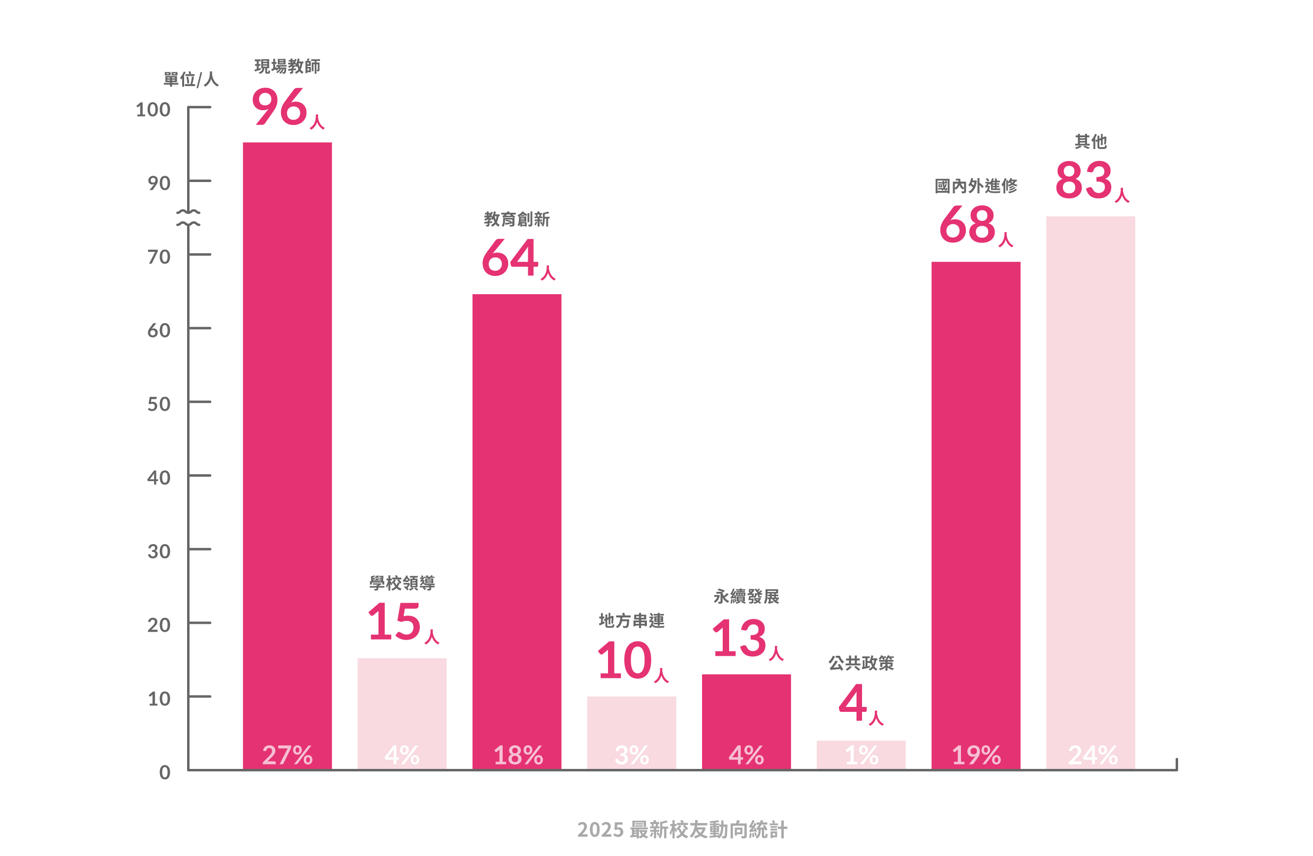 逾三成的校友選擇繼續在教學場域透過教師、組長、主任等身份,發揮影響力。