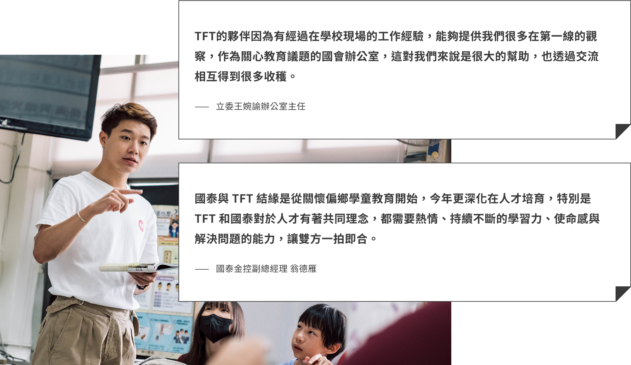 計畫成員們浸潤於教學現場兩年之後成為「校友」,將帶著在現場的體驗與觀察,繼續走上多元的職涯領域,共同為改變教育不平等努力,發揮「集體影響力」。