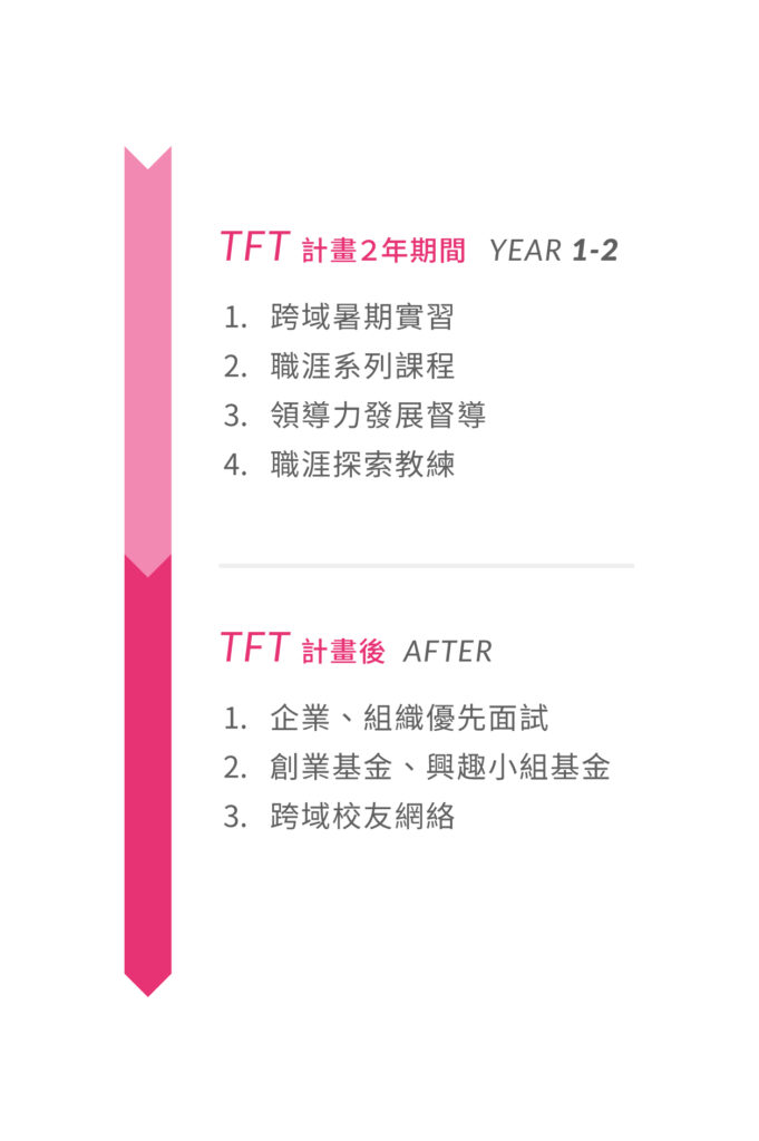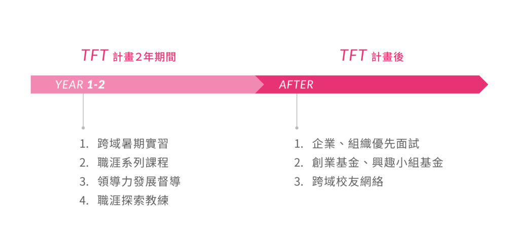 為了讓計畫成員於完成計畫後,能夠帶著兩年的經驗持續於各行各業發揮影響力。從錄取 TFT 計畫後,我們準備了多樣的職涯支持機制給你:
