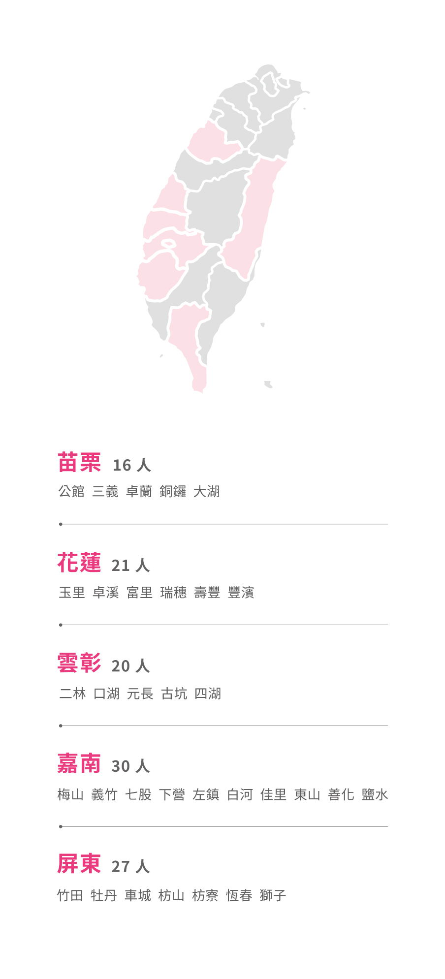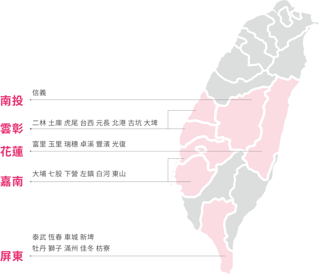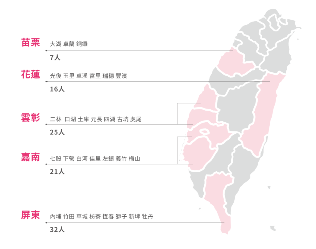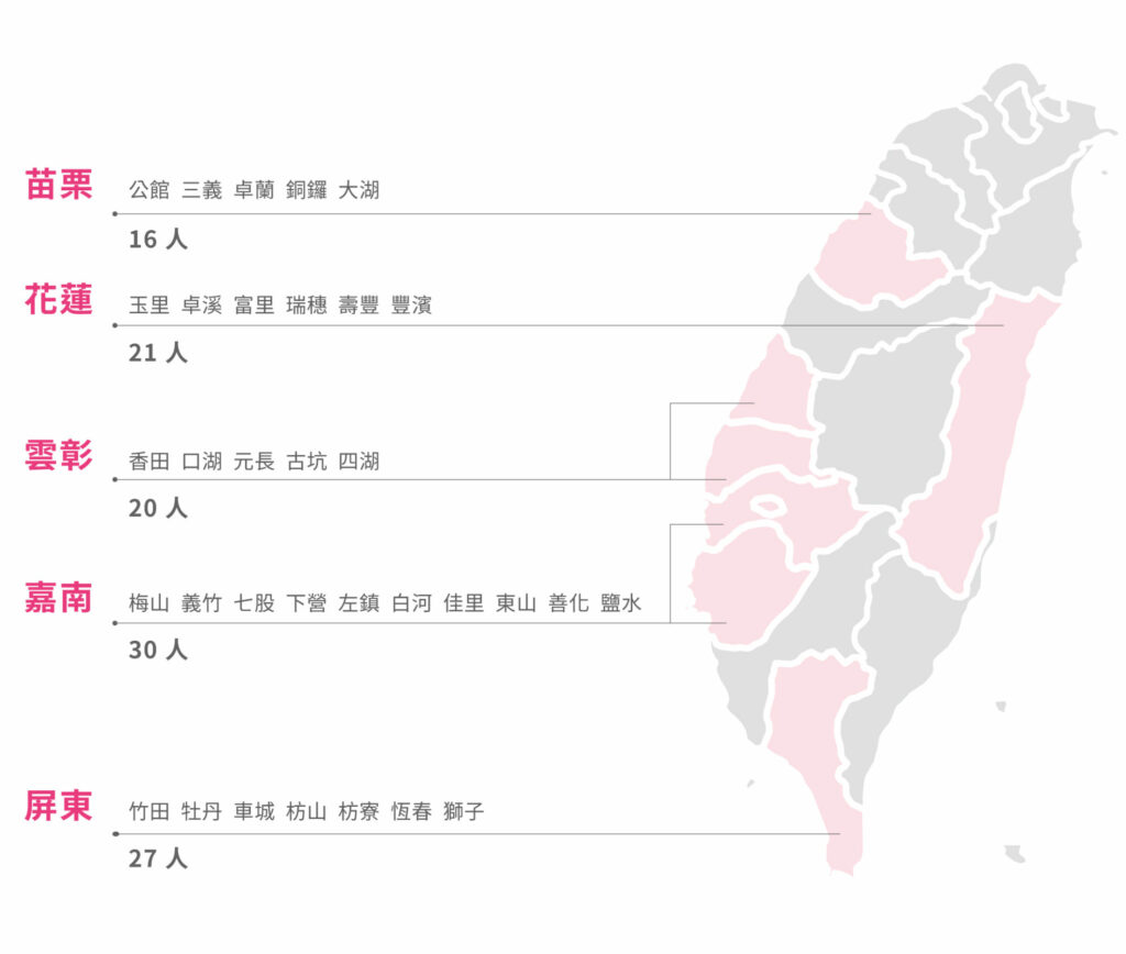 在台灣有超過1000 間的小學因為地理位置、人口背景、環境資源等因素,被教育部定義為偏遠和非山非市學校。 TFT 主要的合作學校類型,也多符合這樣的定義。而 TFT 目前的合作地區,主要分布於苗栗、彰化、雲林、嘉義、台南、屏東、花蓮 7 個縣市。